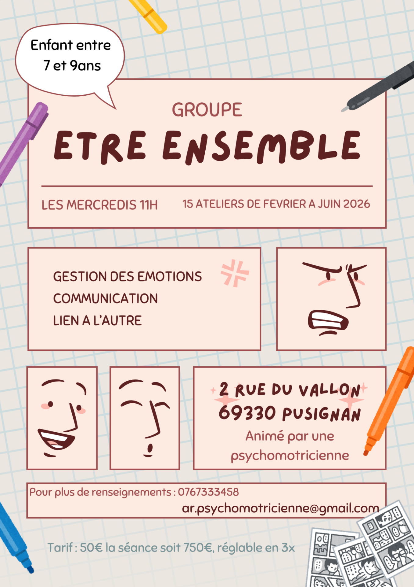 Un nouveau groupe est proposé pour les enfants entre 7 et 9 ans afin de travailler sur la communication avec l'autre (se faire et garder des amis, savoir dire non) ainsi que la gestion de ses émotions dans le groupe (gérer sa colère, sa frustration).